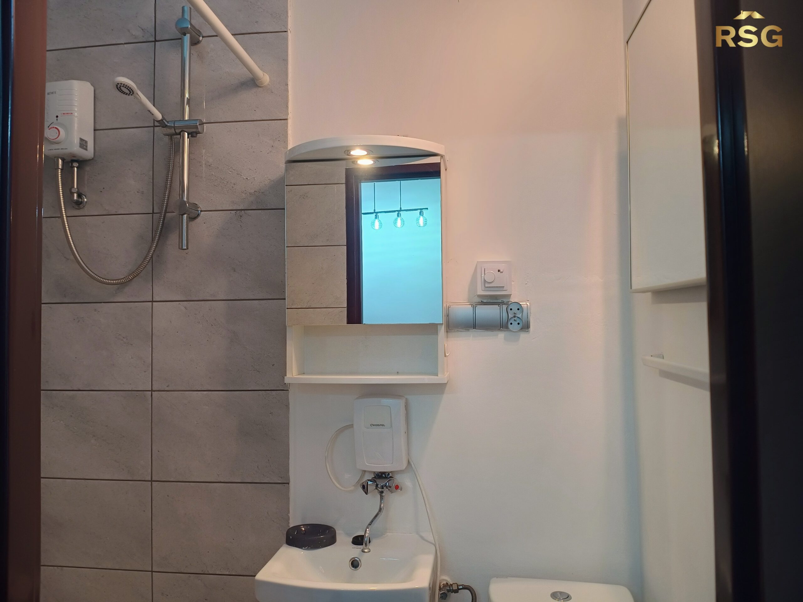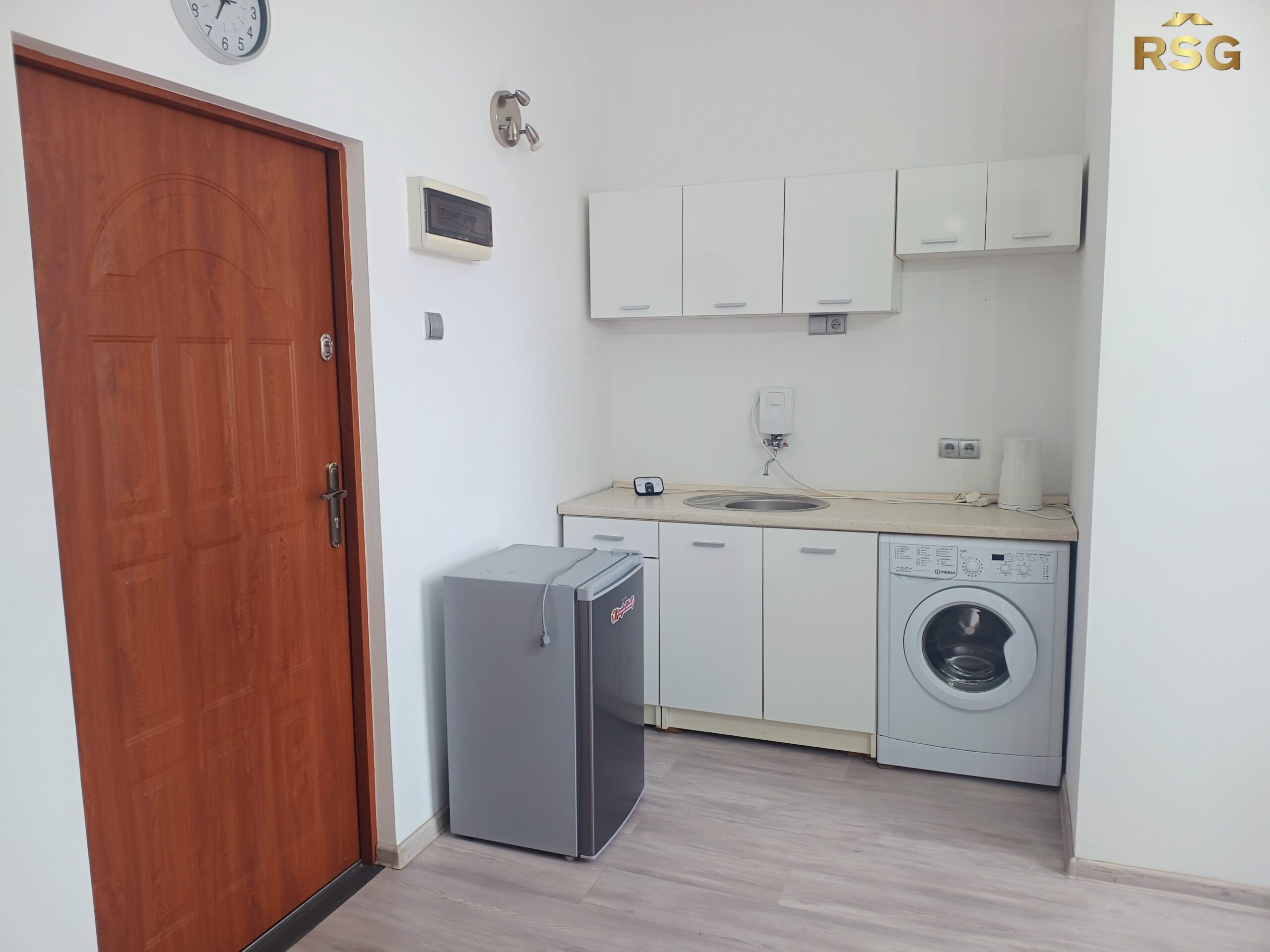 Oddzielna kuchnia z jadalnią została wyposażona w lodówkę oraz pralkę, co zapewnia wygodę codziennego użytkowania. Łazienka posiada kabinę prysznicową. Mieszkanie ogrzewane jest elektrycznie.
